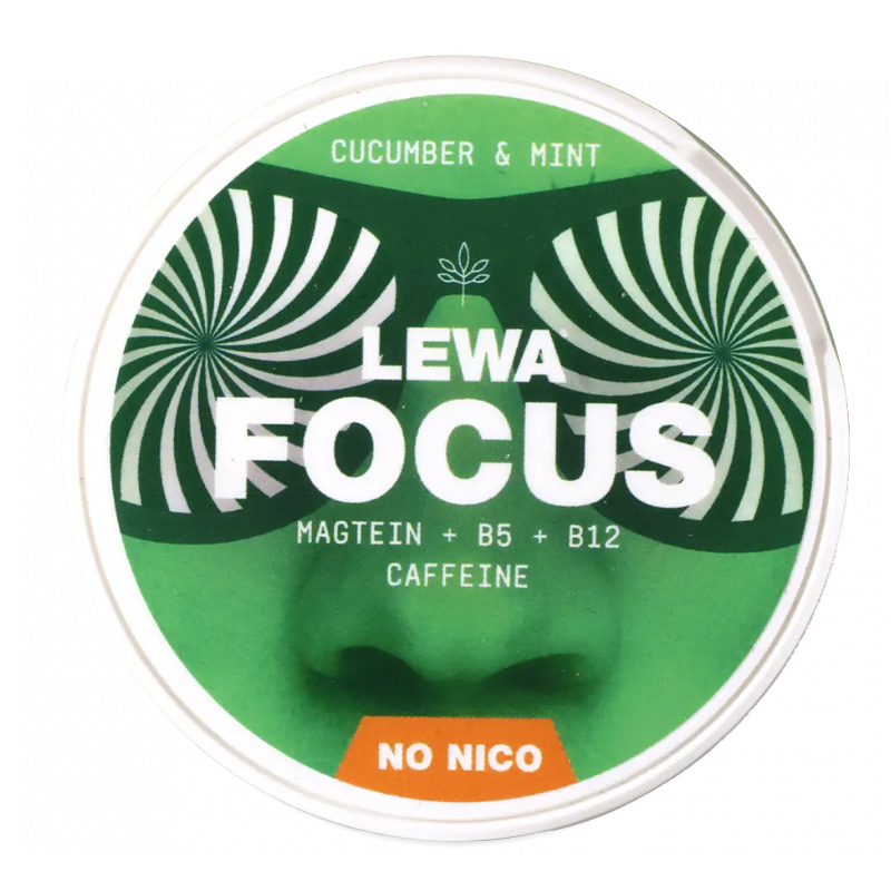 Virkistävä LEWA FOCUS Cucumber & Mint – kevyt kurkun raikkaus ja mintun viileys yhdistyvät B5- ja B12-vitamiineihin, Magteiniin ja kofeiiniin, tukien keskittymistä ja jaksamista ilman nikotiinia. Tuote sisältää kofeiinia 20 mg / annospussi.